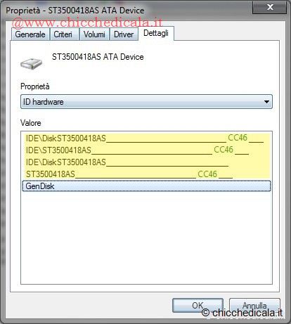 | 1. Per prima cosa, bisogna scoprire quale revisione di firmware monta l’hard disk installato sul PC. Per fare questo, ci sono diversi metodi. Uno è di digitare “devmgmt.msc” nella casella di ricerca del menu Start o nel menu Esegui seguito da Invio. In questo modo aprirete la console “Gestione Dispositivo” (Gestione Periferiche per XP) quindi fare clic destro sul nome della periferica. Scegliere “Proprietà” e nella finestra che si apre selezionare “Dettagli“, quindi “ID Hardware” dal menu a scomparsa. La versione appare vicino al nome della periferica (vedi immagine). 2. Appurato che l’esemplare montato è il modello “ST3500418AS” e utilizza il firmware “CC35“, è il momento di controllare sul sito Internet del produttore (Seagate in questo caso), se sono disponibili firmware più recenti. Si va quindi sul sito di supporto e si cerca il software relativo all’hard disk in questione. Nel caso di Seagate, lo si trova all’interno della categoria “Download”. Successivamente cliccando nella sezione “Firmware Recommendations for internal drives” e sulla scheda “Search” avremo la possibilità di eseguire la ricerca del modello in nostro possesso. | ||
