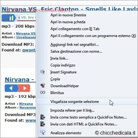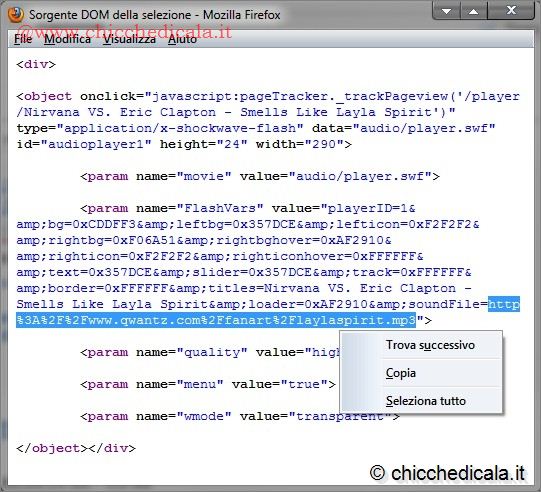 | 1. Individuato il brano il malintezionato avvia la riproduzione del brano e clicca col tasto destro sul titolo, oppure in prossimità del collegamento “Artist“- Successivamente dal menu contestuale seleziona l’opzione “Visualizza sorgente selezione“. 2. Dal menu “Modifica” seleziona “Trova” e nella barra di ricerca (in basso) digitate “http“. Evidenzia e copia col tasto destro il link da http a .mp3. Dal momento che il collegamento è codificato in UTF-8 (Unicode Transformation Format, 8 bit | ||