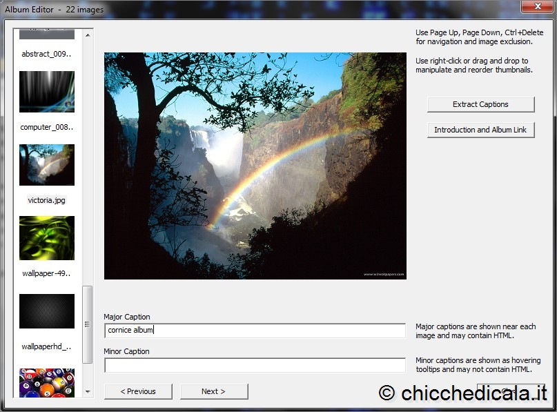 | 3. Fate clic su “Options”: si aprirà una finestra per personalizzare il proprio album. Fate clic su “Examples” (sezione Skin) per scegliere lo sfondo. 4. Eseguite le personalizzazioni, tornate indietro e premete “Edit album”. Sulla sinistra saranno visualizzate le anteprime delle immagini da inserire nel prodotto finale. Nella finestra principale apparirà l’immagine selezionata. Sotto trovate due campi per inserire titoli e didascalie aggiuntivi. Se fate clic su “Extract captions” verranno automaticamente ricavati i dati identificativi (autore, titolo dell’immagine) di ogni foto. | ||