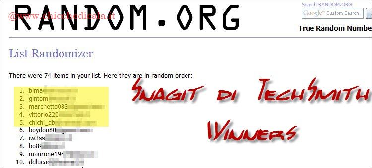 COME PARTECIPARE ?Per tentare ti aggiudicarvi Snagit di Techsmith gratuitamente (solitamente a un costo di $49) vi basterà uno ed un solo commento a questo articolo spiegando il perchè vorreste aggiudicarvi questo prodotto. Il contest si chiuderà il 04/10/2010 alle 18.00, e i vincitori verranno estratti tramite un servizio online chiamato Random.org e contattati via e-mail inserita per commentare. Dopo l’ora prestabilita verrà aggiornata la pagina con i vincitori estratti. | ||