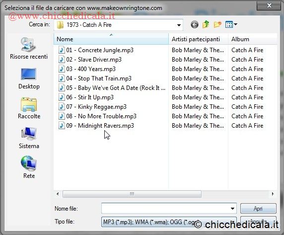 1. Collegatevi al sito www.makeownringtone.com . Comparirà immediatamente la schermata di composizione della suoneria, che verrà realizzata a partire da un file musicale salvato sul PC (o su altri dispositivi collegati al computer).Conviene prima di tutto definire il formato (MP3?) e la campionatura (bitrate) del prodotto finale. Indicate anche dove si intende scaricare il risultato (computer o direttamente sul cellulare). Fate clic su “Upload”. 2. Si apre una finestra di Explorer che permetterà di navigare all’interno del PC alla ricerca del brano desiderato: in basso, nel campo “Tipo file” sono già selezionati i formati supportati dal sistema. Scegliete un brano e fate clic su “Apri”. | ||