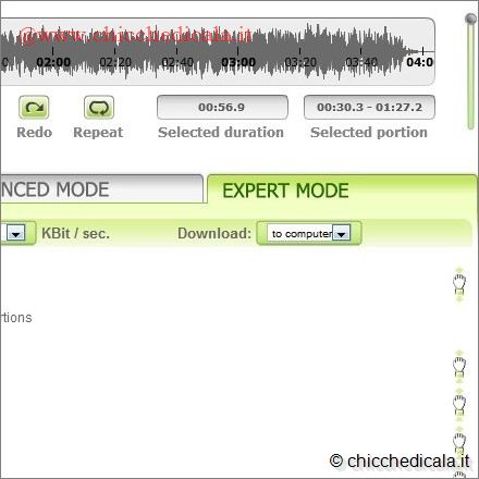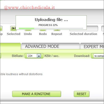 | 3. Viene avviato il processo di upload che, in base alla velocità della vostra connessione, può richiedere anche tempi piuttosto lunghi. L’MP3 utilizzato nel nostro caso, del peso di circa 5 Mb, ha impiegato (con una connessione ADSL standard da 7 Mbps) e in un periodo di modesto traffico (mattina presto), poco più di quattro minuti. 4. Una finestra, al di sopra del menu di selezione, visualizzerà in forma di tracciato l’intero brano: Utilizzate i cursori sinistro e destro per definire la parte di brano da utilizzare per la vostra suoneria. Prima di procedere alla generazione del ring tone, potete ascoltare il risultato premendo il pulsante Play. | ||