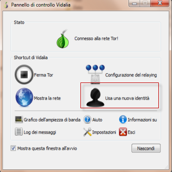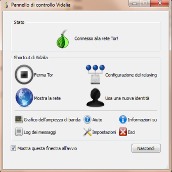 | Questo pacchetto non necessità di installazione, possiamo portarcelo dietro anche in una pen-drive. Per avviare il programma cliccare Start Tor Browser.exe . | Ecco come si presenta il pannello di controllo di TOR denominato Vidalia. Tale servizio è visibile nella piccola icon tray (icona nella barra di sistema/orologio) dalla quale potremo sempre richiamare il servizio. | |
