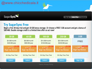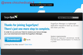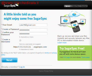 Backup, sincronizzazione e file sharing in un colpo solo! 5Gb di spazio gratuitamente offerto da SugarSync. Come ottenerli? Basta registrarsi, scaricare e installare il programmino (Windows , Mac, Iphone, BlackBerry, Android, Symmbian, Windows Mobile ) e scegliere una o più cartelle (fino ad un massimo di 5gb) da salvare online. Dopo di che, automaticamente tutti i file della cartella verranno trasferiti in uno spazio remoto, protetto e raggiungibile tramite un qualsiasi browser attraverso un indirizzo che ci viene fornito in fase di sharing. Tale link lo possiamo mantenere privato o condividere con Amici ai quali possiamo dare il permesso sia di sola lettura ,che anche di modifica. La sincronizzazione invece consente ti tenere sempre allineate la cartella del pc e quella online. Se aggiungi un file alla tua cartella del tuo pc, automaticamente verrà trasferito sullo spazio remoto. In modo analogo se tu aggiungi un file nel tuo account di SugarSync, questo verrà sincronizzato sul tuo pc locale. Comodo no? Vediamo come funziona.