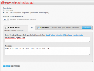 | 10. Dalla mascherina di Send email puoi inviare l’invito a visitare la cartella che stai scegliendo di condividere. Basta inserire uno o più destinatari email. In più puoi scegliere se far accedere in sola lettura, oppure in modifica. Se clicchi Get Link invece ottieni un link che poi puoi scegliere di inviare agli amici , colleghi …via chat, email o semplicemente per memorizzarlo tra i preferiti del tuo browser. |