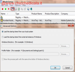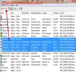 | 1. Una volta avviato il programmino mostra tutto l’elenco dei programmi che possono essere disabilitati al’avvio (puoi sempre scegliere di riabilitarli in futuro), oppure di eliminarli del tutto dalla lista cliccando la X rossa in figura. |