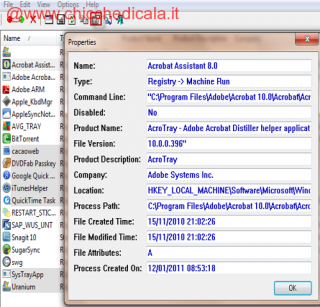 | 2. Se ti posizioni su un programma sul quale hai de dubbi, allora puoi cliccare proprietà per visualizzare in un finestra la versione, produttore , percorso di installazione, chiave di registro, data di creazione, permessi.. |