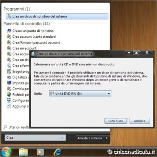 1. Creare un disco di ripristino di Windows 7 è molto semplice. Vai su Start e nella casella di ricerca digita Crea un disco di ripristino del sistema. Inserisci un cd nel lettore clicca su “ Crea Disco“. Se invece hai il il DVD di installazione puoi utilizzarlo direttamente come disco di ripristino.
