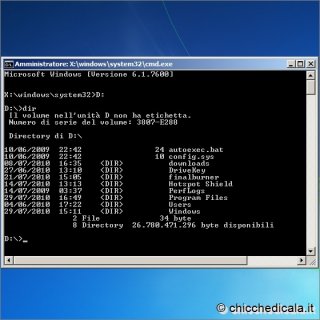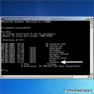 5. Ok, sei nel prompt dei comandi . Se provi a digitare D: seguito da INVIO, entri nella direcotory. Successivamente scrivendo DIR e dando INVIO ti verrà mostrato il contenuto del Drive D: .Il nostro scopo deve essere quello di trovare il drive in cui è contenuta la directory Boot. Se non si trova in D: allora passa allo step successivo.
