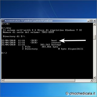 6. Digitiamo E: seguito da INVIO e successivamente DIR seguito da INVIO. In questa schermata, il DVD di Windows 7 è l’unità E:, ed è anche presente la directory di “boot“, quello che volevamo!