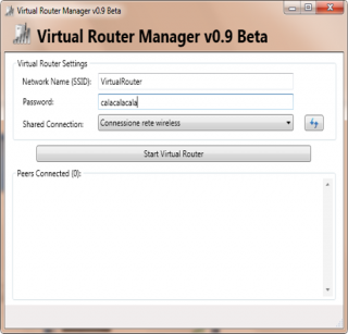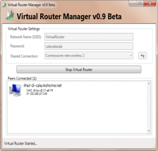 1. Dopo aver installato il programmino, basta avviarlo, scegliere una password di accesso, e cliccare Start Virtual Router. In questo modo, dall’ iPhone, iPad o qualsiasi altro dispositivo mobile, avremo la possibilità di vedere la rete del nostro notebook alla quale accederemo semplicemente indicando la password precedentemente impostata.