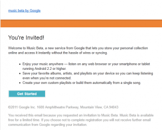 | 1. Ora che abbiamo abbiamo capito come simulare di essere utenti americani, richiediamo l’invito a google music collegandoci alla pagina principale. Clcchiamo dunque su <tt>Request an Invitation</tt>. Dopo qualche giorno dovresti ricevere l’invito di Google come nell’immagine sopra. Clicca su Get Started (ricordati di tenere connesso HotSpot Shield). |