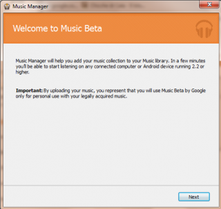 | 2. Google ci ricorda che dobbiamo caricare musica legalmente acquistata e solo per uso personale, non aziendale. Clicca Next. |