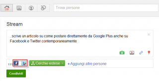 | 2. Dopo aver installato l’estensione, nel box di condivisione visualizzeremo anche i due bottoni di Facebook e Twitter. Cliccandoli si attiva una spunta rossa. Solo cliccando su Condividi l’aggiornamento doventerà effettivo su tutti i Social. |