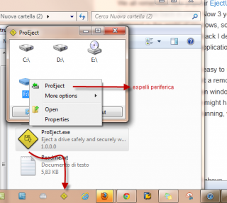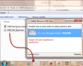 | 1. L’eseguibile non richiede installazione, basta estrarlo in una cartella qualsiasi e da li possiamo eseguirlo. Altra comoda possibilità consiste nel creare un collegamento alla barra delle applicazioni in modo tale che quando vogliamo espellere una perfirica non dobbiamo fare altro che eseguirlo con un clic. Quando si avvia, il programmino mostra l’elenco delle periferiche , basta un doppio clic per espellerlo. |