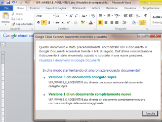 | Google Cloud Connect rileva, gestisce e sincronizza tutte le modifiche apportate ai documenti di Microsoft Office consolidandole in un’unica versione aggiornata per ogni documento. Per ciascun documento sincronizzato tramite Google Cloud Connect viene creato un URL univoco o un indirizzo web che puoi condividere con i collaboratori tramite la chat o l’email. In base alle impostazioni della privacy che hai selezionato per il documento, altre persone saranno in grado di fare clic su questo link e visualizzare il documento nel browser. | ||