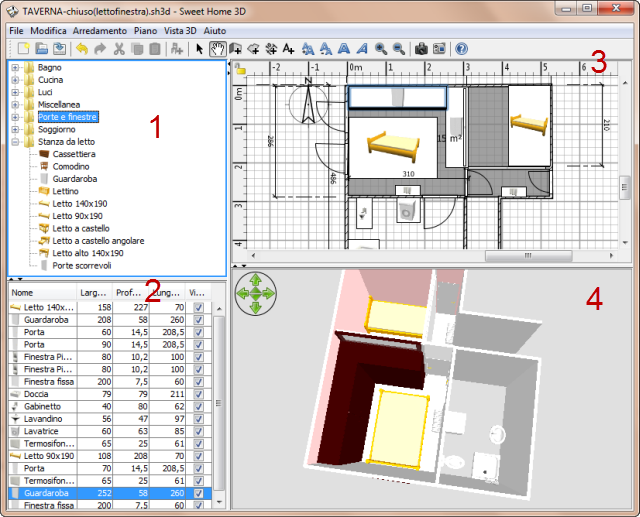 | La finestra di Sweet Home 3D mostra il design interno di una singola casa, ed è divisa in quattro pannelli (i riquadri rettangolare che vedi nella finestra) liberamente ridimensionabili, descritti come segue. |