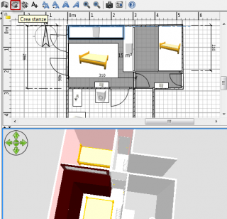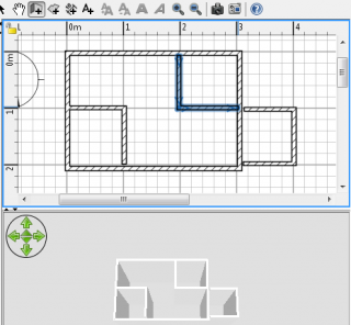 | 3. Per disegnare muri, devi prima scegliere Piano > Crea muri, oppure selezionare lo strumento Creazione muri, indicato in figura. Clicca sulla piantina in corrispondenza del punto iniziale del nuovo muro, poi clicca o fai doppio click nella piantina sul punto finale. Finché non fai doppio click o non premi il tasto Esc, ogni nuovo clic indica il punto finale del muro corrente e il punto iniziale del prossimo muro. Durante il disegno di un gruppo di muri, il punto iniziale del primo muro sarà agganciato ad un muro esistente o a un punto finale se clicchi su questo punto, e l’ultimo muro sarà agganciato ad un altro punto iniziale o finale del muro facendo doppio click su quel punto. I punti cliccati corrispondono al centro dello spessore dei muri disegnati; lo spessore e l’altezza dei nuovi muri può essere cambiato attraverso il pannello preferenze. Se hai già disegnato una stanza, puoi inoltre creare i muri attorno ad essa facendo doppio click in un qualunque punto della stanza I muri sono disegnati contemporaneamente nella piantina e nella vista 3D.. |