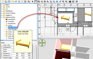 | 4. Per aggiungere porte, finestre o arredamento alla tua casa, trascina uno o più pezzi di arredamento dal catalogo alla piantina della casa o all’elenco dell’arredamento. Puoi inoltre selezionare alcuni pezzi del catalogo e poi scegliere Mobilio > Aggiungi alla casa o cliccare sullo strumento Aggiungi alla casa. Lo strumento Aggiungi alla casa Quando i pezzi sono rilasciati nella lista arredamento o aggiunti tramite la voce di menù Mobilio > Aggiungi alla casa, la posizione del loro angolo superiore sinistro è al punto (0, 0). Quando i pezzi vengono rilasciati nella piantina, la posizione del loro angolo superiore sinistro sarà nel punto in cui hai rilasciato il pulsante del mouse. Quando un pezzo è rilasciato con il puntatore del mouse sopra un muro, esso sarà automaticamente ruotato e ridimensionato a seconda dell’orientamento e dello spessore di questo muro se il pezzo è una porta o una finestra, considerando che un pezzo di altro tipo sarà ruotato in maniera tale che il retro sia avanti al muro. I pezzi aggiunti alla casa sono selezionati e disegnati simultaneamente nella lista arredamento, nella piantina e nella vista 3D. Durante il caricamento del modello 3D dei pezzi aggiunti, questi pezzi sono rappresentati come quadrati bianchi nella vista 3D. Se il catalogo non contiene l’arredo o l’oggetto che vuoi aggiungere alla tua casa, puoi rappresentarne il solo ingombro usando il pezzo Cubo che trovi nella categoria Miscellanea, e ridimensionarlo come desideri; oppure lo puoi cercare in un’altra libreria arredamento, e da lì importarlo. |
