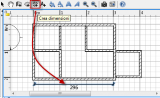 | 6. Per tracciare le dimensioni sulla piantina, devi prima scegliere Piantina > Crea dimensioni o selezionare lo strumento Crea dimensioni. Ogni dimensione è creata con tre click nella piantina della casa: Il primo click imposta il punto iniziale della nuova dimensione. Il secondo click imposta il punto finale. Il terzo click ti aiuta ad impostare la misura delle linee di estensione disegnate alla fine del processo di disegno delle linee di estensione. Se non muovi il mouse fra il secondo e il terzo click la nuova dimensione non avrà nessuna linea di estensione. In ogni momento puoi premere il tasto Esc per cancellare la creazione della dimensione corrente. Durante il secondo passaggio, ogni movimento del mouse aggiorna nella piantina la lunghezza della linea dimensionale che stai tracciando e la cifra che indica la lunghezza di tale linea. |