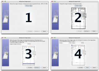8. Per importare un’immagine da visualizzare come sfondo nella piantina della casa e velocizzare il disegno dei muri, scegli Piano > Importa immagine di sfondo. Gli step sono i seguenti : - Trascina il file di un’immagine nel riquadro mostrato nella procedura guidata, o clicca su Scegli immagine e seleziona un file BMP, JPEG, GIF o PNG.