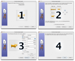 9. Per importare nel tuo catalogo arredamento e/o nella piantina di casa un modello 3D esistente, scegli Arredamento > Importa arredamento… o trascina il file di un modello 3D file in una finestra di Sweet Home 3D. Queste operazioni visualizzano una procedura guidata che ti aiuta se necessario a scegliere il file di un modello 3D e definisce le sue caratteristiche in pochi passi. - Clicca su Scegli modelli e scegli un file in formato OBJ, DAE, 3DS, LWS o un file ZIP contenente un file di questo tipo. Dopo che il modello è stato caricato, clicca su Continua.