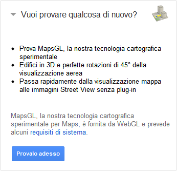 L’installazione di questa nuova features è semplicissima, in fondo a sinistra di Google Maps troverete una pulsante con scritto “Vuoi provare qualcosa di nuovo?”, cliccateci e comparirà un menù illustrativo come quello evidenziato nell’immagine qui affianco. Se accetterete di provare il servizio, Google Maps effettuerà un veloce riconoscimento della vostra scheda video per vedere se è abilitata al WebGL. C’è da dire, inoltre, che al momento solo Chrome e Firefox supportano questa nuova tecnologia.
