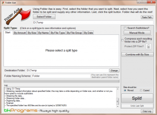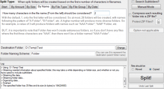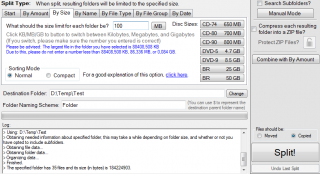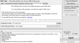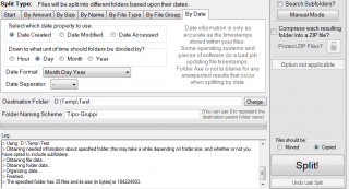 | 3. Con questa modalità possiamo scegleire le dimensioni massime delle cartelle che ospiteranno i nostri Files. Ad esempio se abbiamo 5 Gb di files e se scegliamo la dimensione cartella di 1Gb , i files verranno classificati in 5 cartelle da 1Gb. Possiamo scegliere tra spostarli (opzioni Moved e tasto Split ) o copiarli (opzioni Copied e tasto Split) |