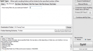 | 2. Con questa modalità scegliamo il numero massimo di cartelle nelle quali i file verranno copiati o spostati. Ad esempio, scelgiendo 5, tutti i file verranno distribuiti in cinque cartelle e distribuiti all’interno delle stesse. Possiamo scegliere tra spostarli (opzioni Moved e tasto Split ) o copiarli (opzioni Copied e tasto Split) |