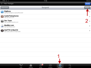 1. Portarsi in gestione Sorgenti di Cydia | 2. Aggiungere il repository http://cydia.hackulo.us | |