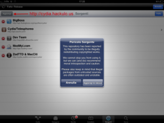 | 2. Cliccando su Modifica, compare in alto a sinisra l’opzione Aggiungi. attraverso la quale si può inserire il link del repository http://cydia.hackulo.us. Come già indicato da noi, anche il nostro iDevice mosterà un messaggio in cui ci viene indicato che questo repository è ritenuto dalla comunità come illegale e pericoloso per la stabilità del sistema. | ||