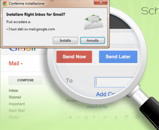 funzionalità del client di posta. Manca però un’opzione molto richieste dagli internauti, quella che consente di schedulare le email all’orario desiderato, magari per inviarci un promemoria, magari perché utile in ambito lavorativo o scolastico. Oggi recensiamo RightinBox, un’estensione per i browser Firefox e Chrome davvero utile che integra la webmail di google con un bottone,send mail, cliccato il quale potremo scegliere l’orario e la data di invio posticipato della mail.