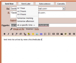| 2. Dopo aver installato Rightinbox, ogni volta che scriveremo una mail troveremo a fianco del solito bottone Send (invia) anche il nuovo bottone Send Later. Scriviamo la nostra email e clicchiamo Send Later. Vedremo comparire tutte le opzioni di schedulazione, tra le quali at specific time, con quest’ultima opzione potremo scegliere la data e l’ora in cui la mail deve essere inviata. Ci sono anche altre opzioni come quelle che consentono di inviare la mail entro 1, 2, 4 ore, oltre che inviarla nella prima mattina e pomeriggio del giorno successivo. | ||