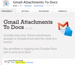 L’applicazione di Google Docs permette di creare, modificare e condividere dei documenti compatibili con quelli di Microsoft Office, ma senza installare nulla sul proprio computer. Basta effettuare l’accesso con il proprio account di google. Oggi giorno, chi studia, lavora o vuole comunque condividere documenti in tempi rapidi, non può fare a meno delle chicche google. Per questo motivo la nostra attenzione è sempre stata alta su questi prodotti, qualcuno ricorderà gli articoli su come condividere da Microsoft Office il documento appena creato su Google Documents, oppure su come apire documenti compressi in google docs. Per chi non avesse ancora la casella di posta di Gmail, consigliamo di provvedere a registrarsi gratuitamente. Oggi vedremo un’interessante estensione di Chrome per sfruttare al meglio l’accoppiato gmail è googole documents, La chicca in questione si chiama Gmail Attachments To Docs, grazie alla quale, alla ricezione di uno o più allegati nella nostra casella di posta di gmail, potremo visualizzare il link Save To Docs. Grazie a questo nuovo link potremo salvare l’allegato direttamente nel nostro account di Google. Una vera comodità per rendere ancora più potente l’accoppiata Gmail + Docs.
