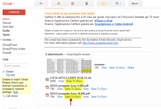 | 2. Una volta installata l’estensione, la pagina di Gmail verrà riaggiornata. Alla ricezione delle prossima email contenente uno o più allegati, potrà essere visualizzato in basso al corpo della mail, oltre ai link View e Download, anche il link Save do Docs. Basta cliccare questo link per trasferire sul nostro account di google documents l’allegato in oggetto. |