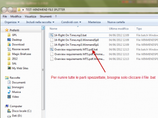 | 2. Per riassemblare tutte le parti spezzettate del file (Merge), ci sono due modi. Il destinatario che riceve il file spezzettato può ricomporre il tutto eseguendo il file .bat ricevuto (l’importante è che tutti i file, compreso il file .bat, risiedano nella stessa cartella) Il secondo metodo invece è quello di far utilizzare, anche al destinatario, il file il programa Winmend File SPlitter. Infatti, il tab Merge Files preve anche la funzionalità di ricomposizione delle parti del file. |